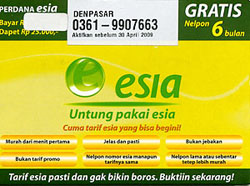 こちらもCDMA方式。桁数は一桁多いものの、0361−9******というウブドもどきの電話番号が取得できます。クタなどのお店の電話でも0361−7******というような7桁番号はフレキシーのSIMを電話機の底面に差し込むタイプの電話機を使っていることになります。特番使用で日本へは1分1500ルピア程度。